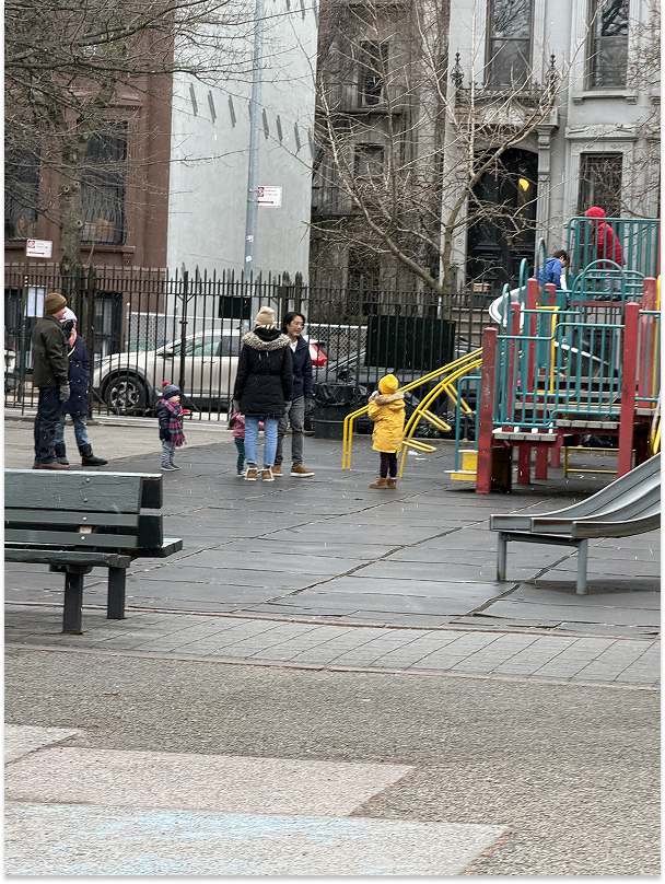 If we were going to sell to kids (via their parents), we would need to go to the playground, which we did this morning in a light 8:30am snow. We brought all five Donut Hats in a bag, and laid them out on a built-in table/chess board. There were only two other parent-kid combos there, and neither looked particularly in the mood to spend, so Dev half-heartedly and Maya full-throatedly yelled, “Get your Donut Hats! Ten BUCKS!” No one heard. It’s a big playground.