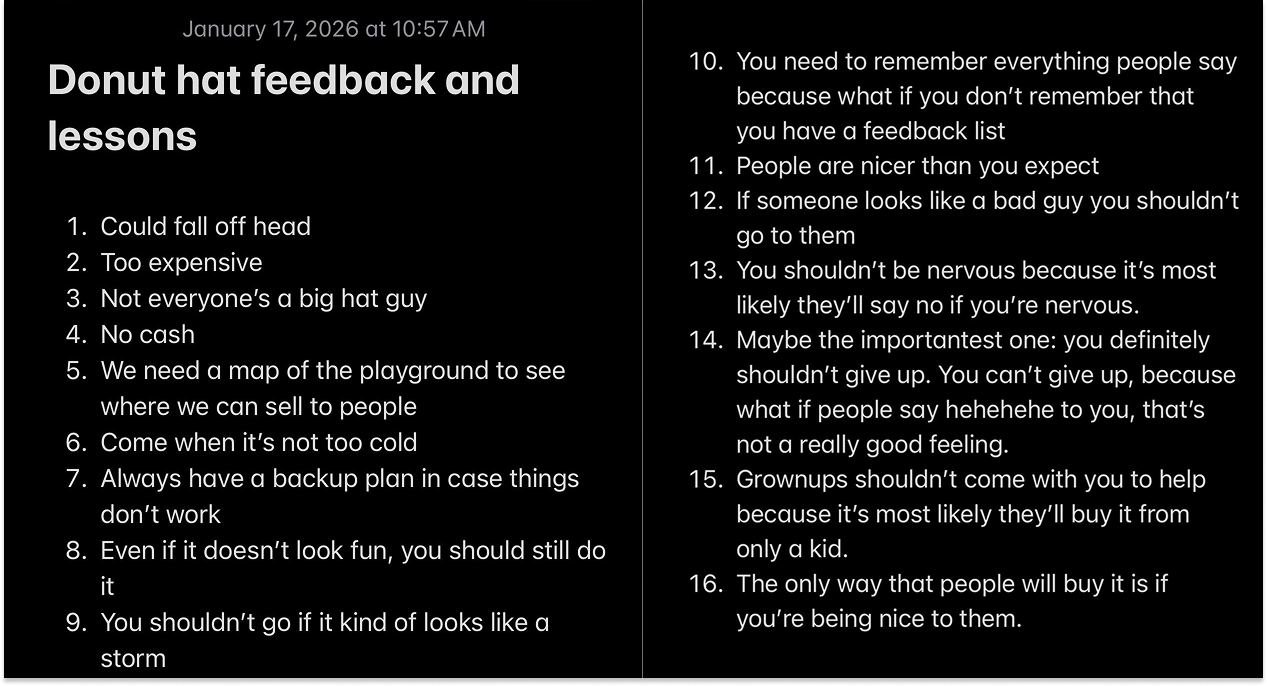 HUGE. That was the first of what will be many, many No’s in Dev’s life, and he handled it gracefully. I told him it was awesome. We’d gotten our first customer feedback. I pulled out Apple Notes, titled it “Donut Hat feedback,” and told him we should write down all of the feedback we get so that we could go home and improve the product.