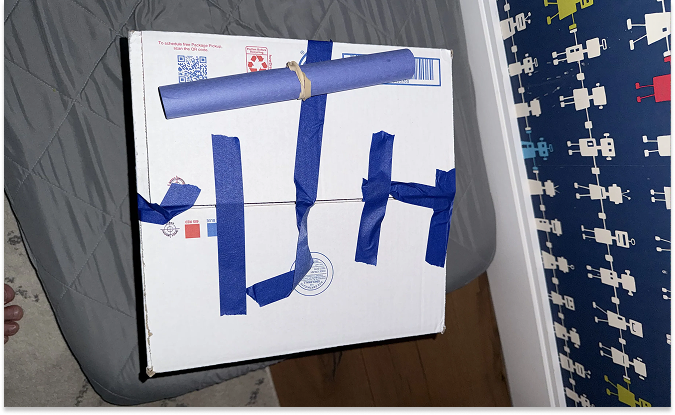I guess that afternoon, he took some Play-Doh, shaped it into a ring, taped it up with blue masking tape (kid loves tape), and realized he might be on to something. He put the first donut hat in a construction-paper envelope, put the envelope in a box, and taped that shut, too, for safe keeping. Then he got to work.