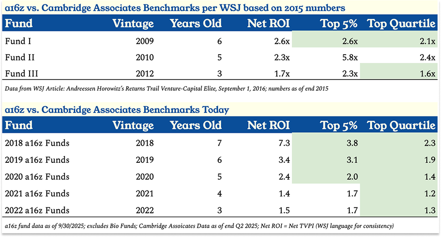 In 2016, The Wall Street Journal published an article that Acquiredâs David Rosenthal called âso clearly a hit piece planted by rival venture firmsâ titled Andreessen Horowitzâs Returns Trail Venture-Capital Elite, when its funds were seven, six, and four years old, respectively. It showed that while AH Fund I was a top 5% VC fund, AH II was merely top quartile, and AH III was actually slightly outside of the top quartile.