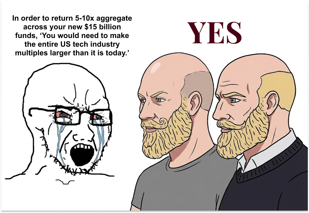 That itâs too loud. That it should shut up and dribble, politically speaking. That you donât agree with a recent investment or two. That it is unbecoming to Quote Xeet the Pope. That there is no way it will ever generate a reasonable return for LPs on such enormous funds.