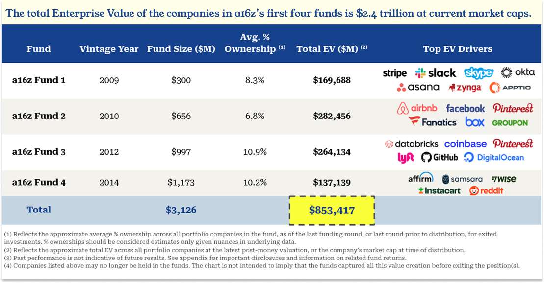 Below is the aggregate portfolio value of those first four funds, the ones that would have had to be worth $240-480 billion to clear that rival VCâs hurdle. Combined, a16z Funds 1-4 had a total enterprise value of $853 billion at distribution or latest post-money valuation7.