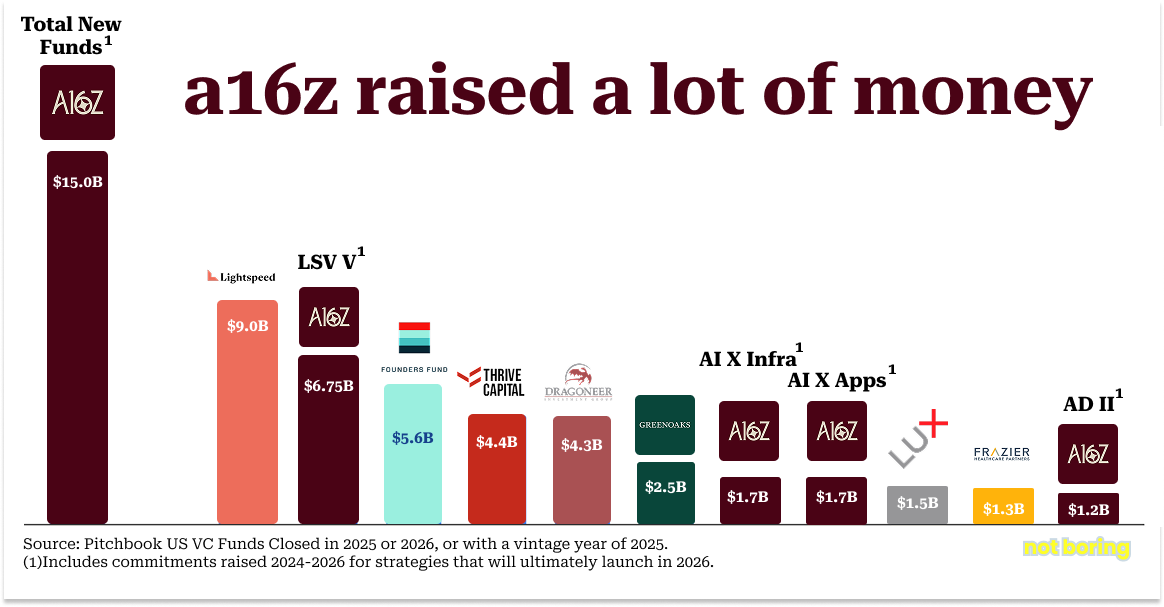 In the worst VC fundraising market in five years, a16z accounted for over 18% of all US VC funds raised in 20253. In a year in which it took the average VC fund 16 months to close their fund, a16z took just over three months from start to finish.