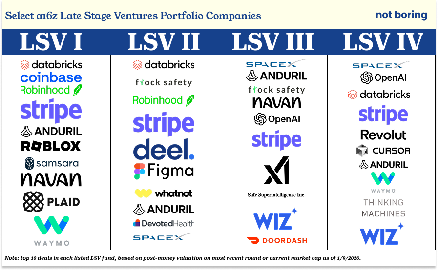 Today, across all their funds, a16z is an investor in 10 of the top 15 private companies by valuation: OpenAI, SpaceX, xAI, Databricks, Stripe, Revolut, Waymo, Wiz, SSI, and Anduril.4