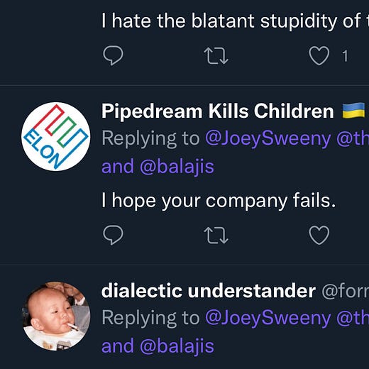 The impact is less obvious in the quotidian, but on the whole, it’s equally depressing. Whenever a founder tweets something, they’re either hit with indifference – a common and familiar outcome – or some idiot in their replies or quote tweets telling them how dumb the idea is, that it’s pointless because we already have “x”, that it will never work, and worse.