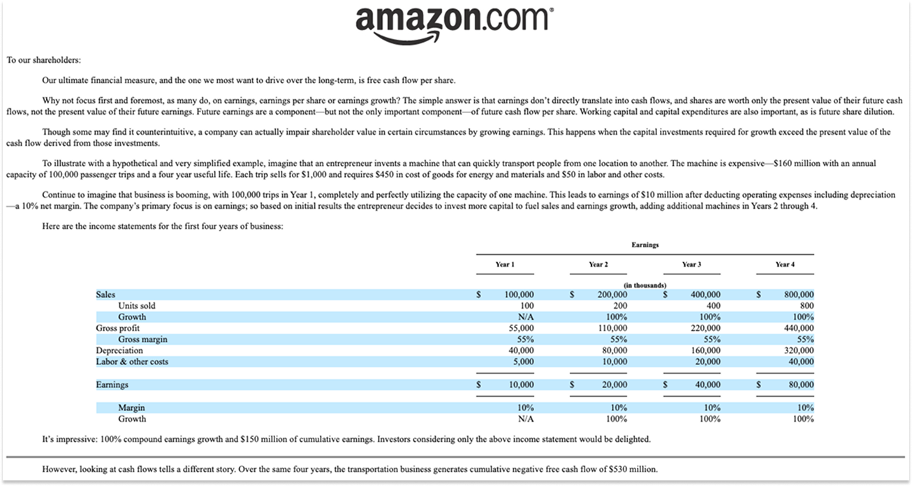 Jeff Bezos is a generational entrepreneur who came from a hedge fund and made a very calculated decision to lose money in the short term if it meant making more of it in the long term. In his 1997 Letter to Shareholders, his first as a public company CEO, he makes the trade-off he’s willing to make clear: “When forced to choose between optimizing the appearance of our GAAP accounting and maximizing the present value of future cash flows, we’ll take the cash flows.”
