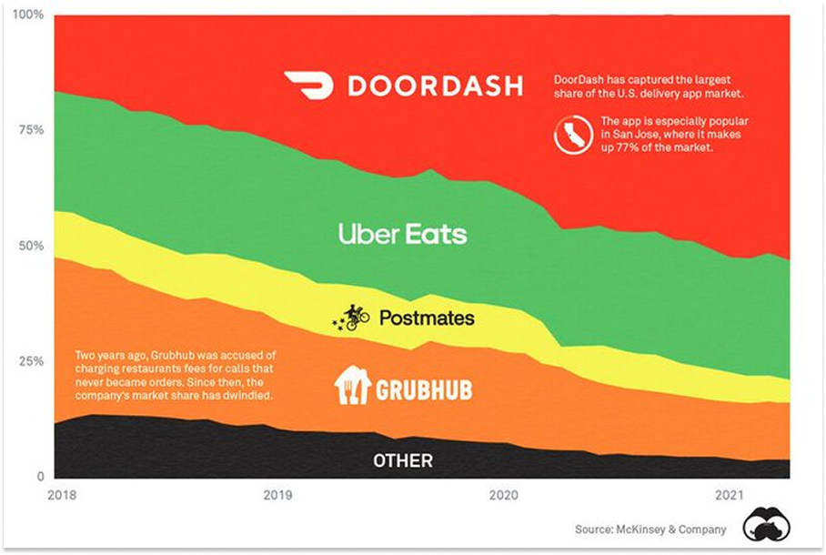 Then again, using Uber as an analogy – literally, as in Uber-for-X – has kept the startup graveyard operators in business. The one successful company that could be called an Uber-for-X is DoorDash, and it worked explicitly because the team looked at Uber, said “there’s something interesting here,” and then tuned it to fit the situation at hand. Instead of competing in dense urban markets, they took the model to underserved suburbs, where competition was lower, CACs were lower, average order values were higher, retention was higher (fewer alternatives), pickups and dropoffs were easier (stores and homes have driveways and parking lots), and then, per Dan Hockenmaier, they executed relentlessly: “They made deliveries just a little faster and more reliable every week. They scrutinized the quality of every one of their restaurants and dashers. They optimized cost out of the system and gave it back to customers in the form of Dashpass (which launched in 2018 at the start of this chart).”