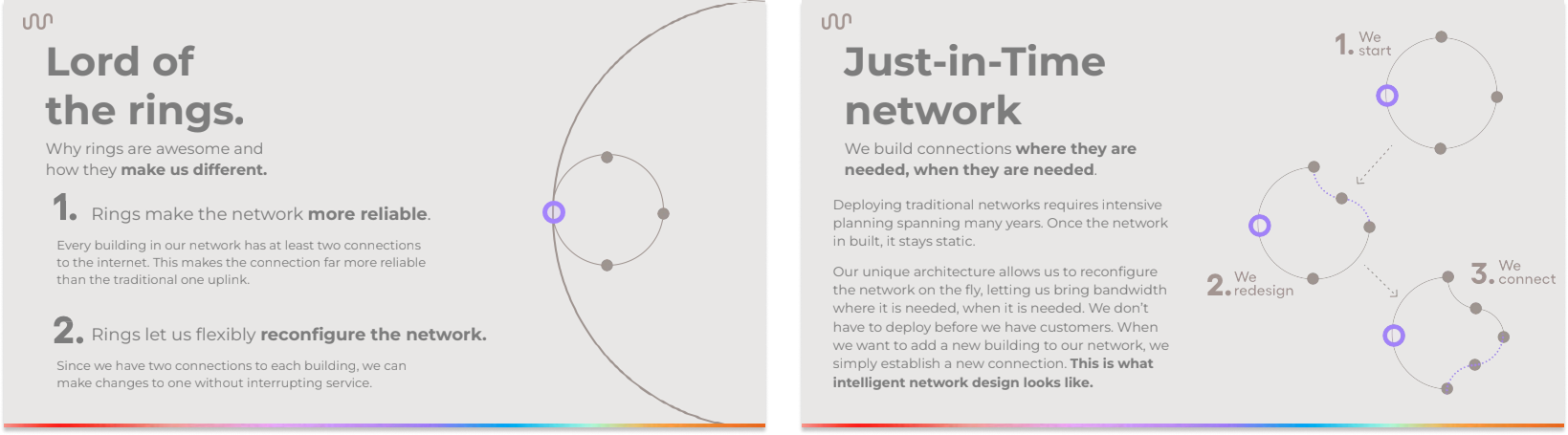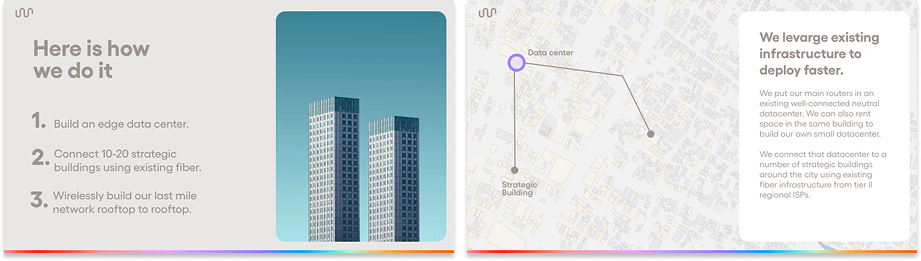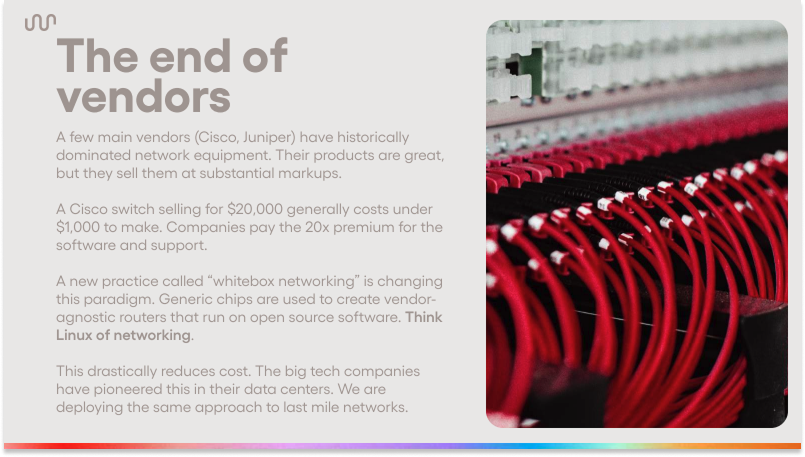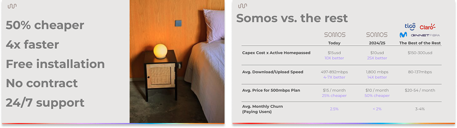 Because of its structurally superior cost structure and network architecture, Somos can offer a better product (1-2 Gbps low-latency, redundant internet) at a lower price (as low as $8/month). Because it makes its own hardware, and writes its own software and firmware, it is able to understand its network in a way that no incumbent can, and fix issues more quickly. The network improves as it grows, which is unique to the architecture, and is cheap and easy to upgrade.