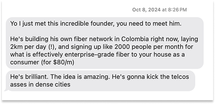 I haven’t been in venture for that long, just five years, but it felt like a once-in-a-career opportunity to back a business with a practically boundless market (infrastructure) led by a founder who struck me as the best systems thinker I’d ever met. As I wrote an LP the next day, explaining why I had invested in a Colombian telco after one very long coffee and exactly zero post-meeting due diligence: