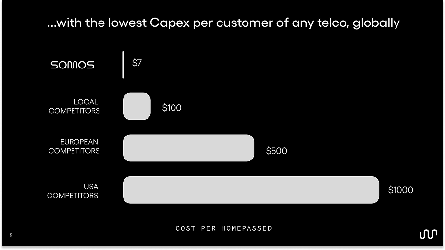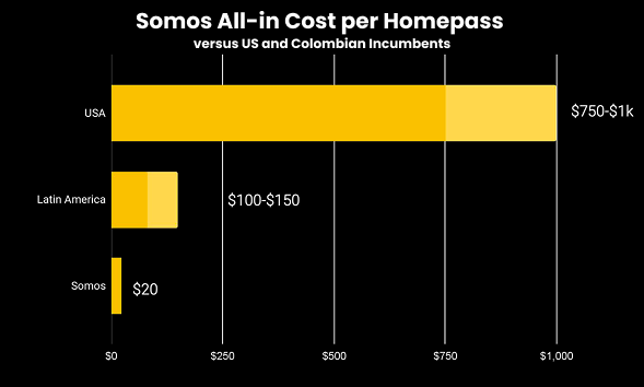 What that means practically is that Somos is currently spending $20 of CapEx per homepass (the cost to build out network infrastructure to reach a potential customer, whether or not they actually subscribe to the service), $7 for hardware and $13 for labor. Incumbents in Colombia pay $100 per homepass in dense urban areas, and incumbents in the US pay $500-1,000.
