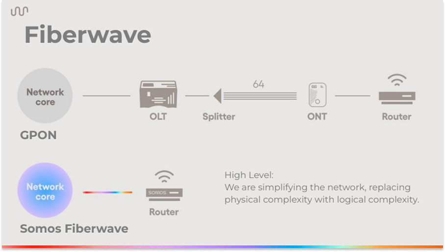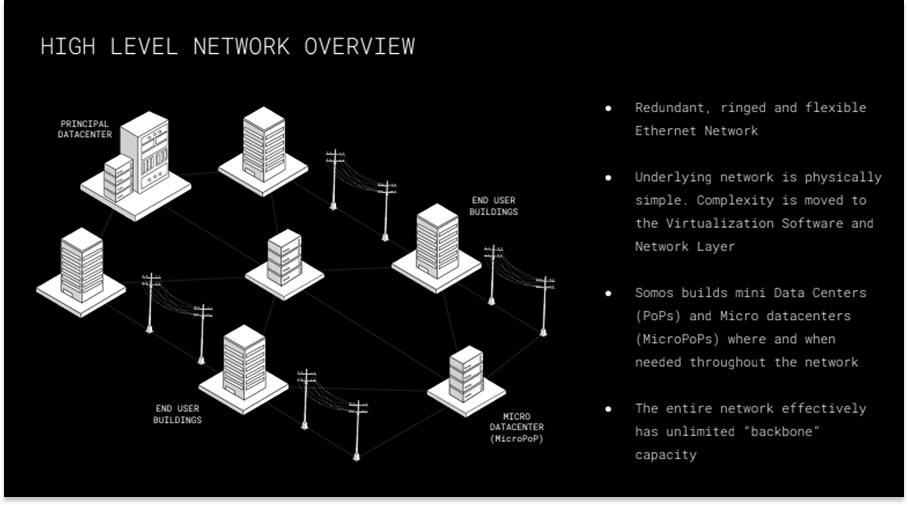 It is building a network based on an Active Ethernet architecture borrowed from data centers. We will go into the details, but the easiest way to think about it is this: whereas traditional telecommunications networks are physically complex, requiring expensive hardware that needs to be upgraded every 3-5 years, Somos’ network is physically simple and pushes complexity to software.