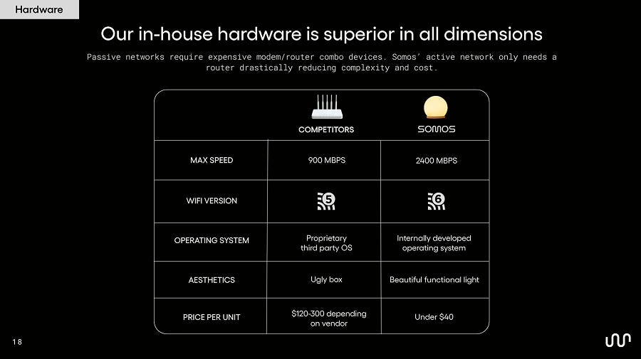 This architecture only works because of Somos’ vertical integration. It would be “exceedingly hard” to do, for example, if Somos didn’t make its own routers and switches.