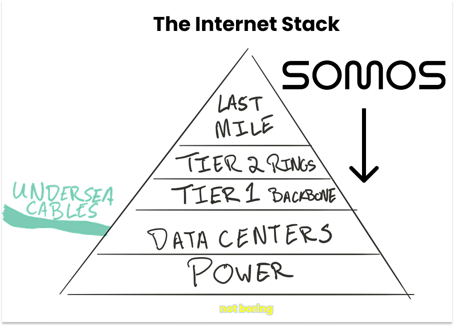 So then, in the same way that Google decided to build Google Fiber to make Google.com work better once it had squeezed every pixel on the homepage, Somos can keep moving down the stack to make the last mile work better.