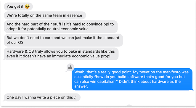 But there’s a chasm between writing a manifesto and seeing it manifest. I tweeted, “This is going to be one of the most fascinating things to figure out in the next few years, how to build software that both wins capitalism and is good for us.”