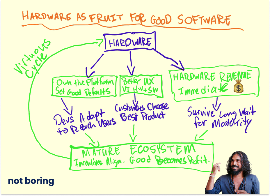 Hardware allows you to solve the problem of resonant software not providing a benefit for the user immediately, it not having a benefit for the dev immediately, and being able to survive the valley of death that is the three to five to seven, 10 years before this actually serves to accrue value for your ecosystem, for your community, for the customers, for the devs, whatever it may be.
