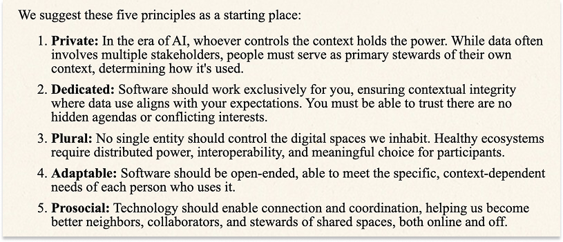 By the “right” thing, here, the “good for you defaults,” we mean those like the Resonant Computing Manifesto’s five principles: Private, Dedicated, Plural, Adaptable, Prosocial.
