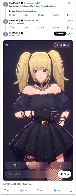 Companion Mode is AI waifus and AI Chads, animated avatar experiences currently exclusive to iOS users who subscribe to SuperGrok Heavy for $300 a month. Those who fork over 25% more than the per capita Gross National Income of Burundi each month can both speak to the avatar and hear her respond. And watch her respond. The animations sync, creating an immersive, spoken conversation feel. Mike Solana wrote about the implications in Goonpocalypse.