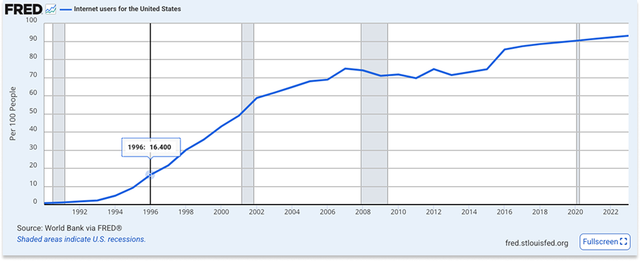 When he said that, in 1996, only 16.4 in every 100 Americans used the internet. Today, 93.1 out of 100 of us do.