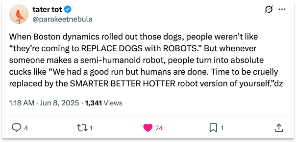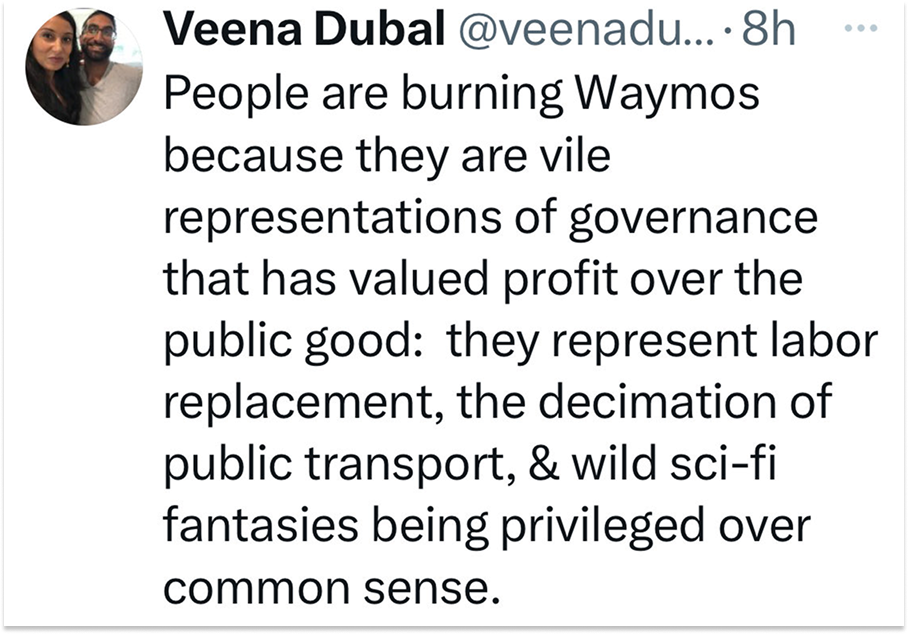 I am as pro-Waymo, anti-burning Waymos as anyone (lock them up), but if we think the kind of sentiment expressed by this UC Irvine professor will get less prevalent as technology touches every corner of the economy, we have our heads in the sand.