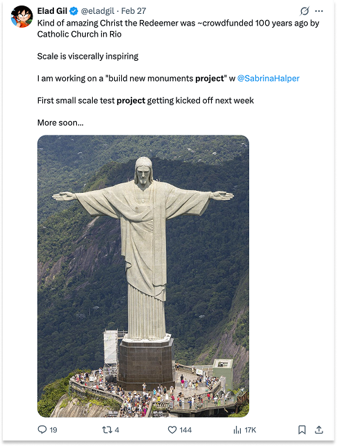 In May of last year, Elad told Turner Novak about Monuments: “I'm in the process of looking for somebody to help do this because I don't have the time myself to do a bunch of stuff right now.” And about Ancient Greece-inspired K-12 schools: “And so this is another one where I would need somebody to drive it, and I'm very happy to sponsor that.”