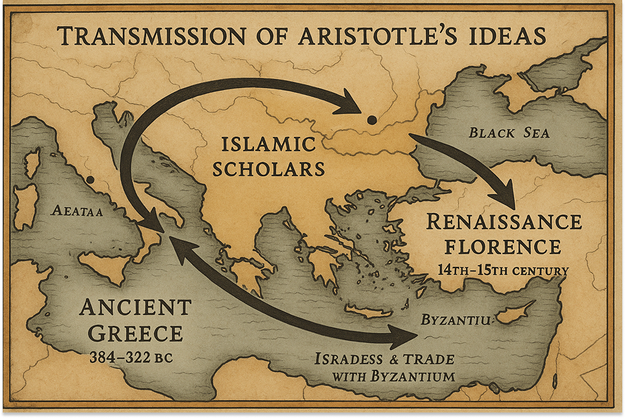 Aristotle’s conception of Magnificence made its way to Florence via a circuitous route across space and time. Lost to the West after the fall of the Western Roman Empire, it survived through Islamic scholars like Avicenna and Averroes, until the Crusades and increased trade with Byzantium brought Europeans back into contact with Greek-speaking Christians, and with the Arabic translations of Aristotle. There, Latin scholars retrieved manuscripts and began commissioning translations, from Arabic, and then directly from Greek. Meanwhile, with the fall of Constantinople in 1453, Greek scholars fled to Italy, bringing with them the original Greek manuscripts and the ability to teach the language directly. This Greek influx, the invention of the printing press, and a renewed interest in Greek philosophy, accelerated the spread of Aristotle’s ideas that was already afoot.