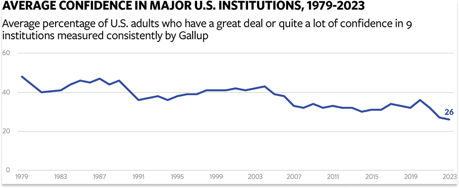 We live in an era of declining trust in institutions. Last year, Pew collected some of the Data Behind Americans’ Waning Trust in Institutions. Average confidence in major U.S. institutions is down from ~50% in 1979 (coming off of Watergate and Vietnam, mind you) to just 26% today.