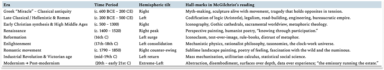 What’s true in humans, McGilchrist argues, is also true of civilizations. In his books, he maps the hemispheric tilt of western civilization over time.