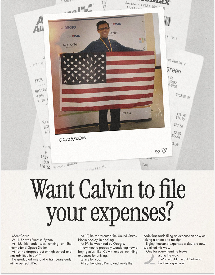 This is one of the most surprising changes since the last time I wrote about Ramp. When I was talking to Eric about sponsoring Not Boring last year, he looped in… Calvin, who I was not expecting to see on the marketing team.