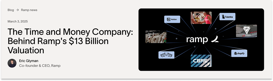 The markets tanked soon thereafter, and while most companies tried to hold on to their ZIRP-era valuations for dear life, Ramp was one of the first to take its medicine, raising $300 million at a $5.5 billion valuation in August 2023. A company so relentlessly focused on time can’t hold on to the past; it needs to take stock of the present and once again look forward.