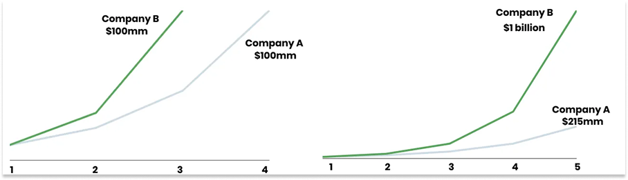 Take two companies, Company A and Company B. Company A reaches $100 million in four years, growing 115%. Company B takes three years, growing at 216%. In year five, Company A will be at $215 million in revenue. Company B will be 5x higher: $1 billion.