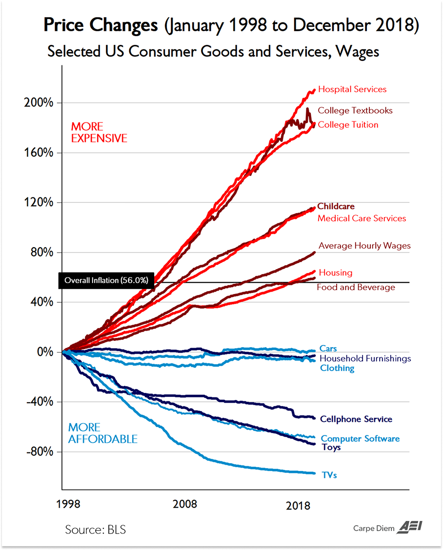 On our call, he mentioned a different but related chart, this one that’s familiar to a lot of people in tech, a symbol for the idea that anything on which tech is allowed to work its magic gets cheaper over time, while every industry that lets bureaucracy win gets more and more expensive.