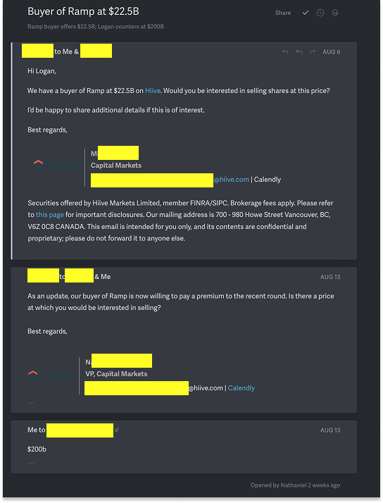 Even at this price, my friend Logan Bartlett, a Managing Director at Redpoint who’s led the firm’s investments in Ramp, has no desire to sell. Is there a price at which he would be interested in selling? $200 billion.
