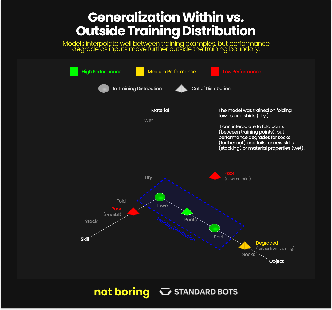 Robots can interpolate within their training distribution. They struggle outside of it. This is true for LLMs, too. It’s just that their training data sets are so large that there isn’t much out of distribution anymore.