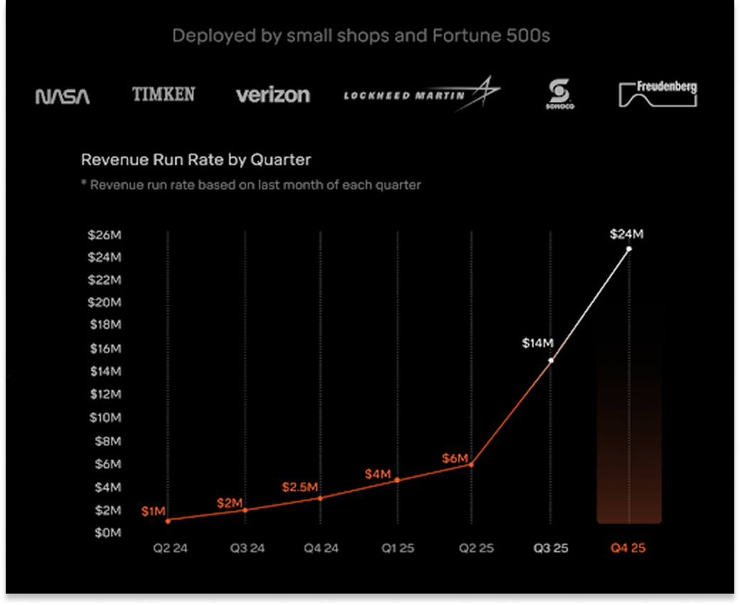 It’s working so far. We have 300+ robots deployed at customers including NASA, Lockheed Martin, and Verizon. We ended the year on a $24 million revenue run rate, with hundreds of millions of dollars in customer LOIs and qualified sales pipeline. The kink you see in this curve is due to the fact that our robots keep getting better and easier to use the more they (and we) learn.
