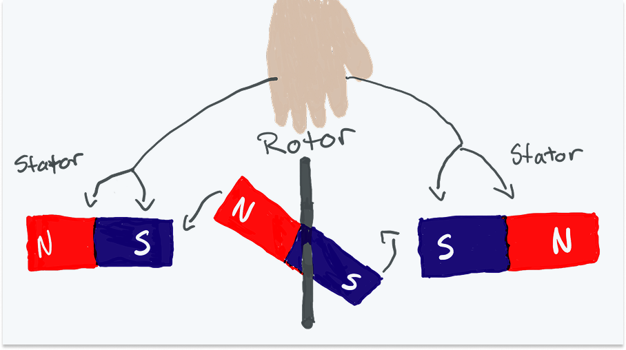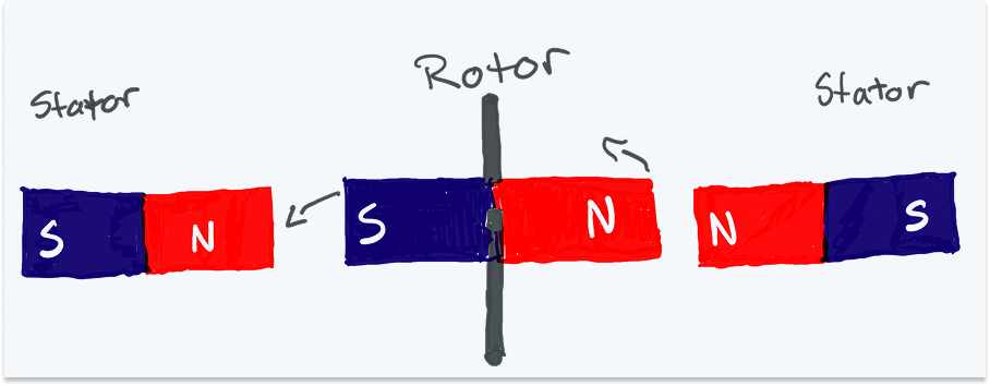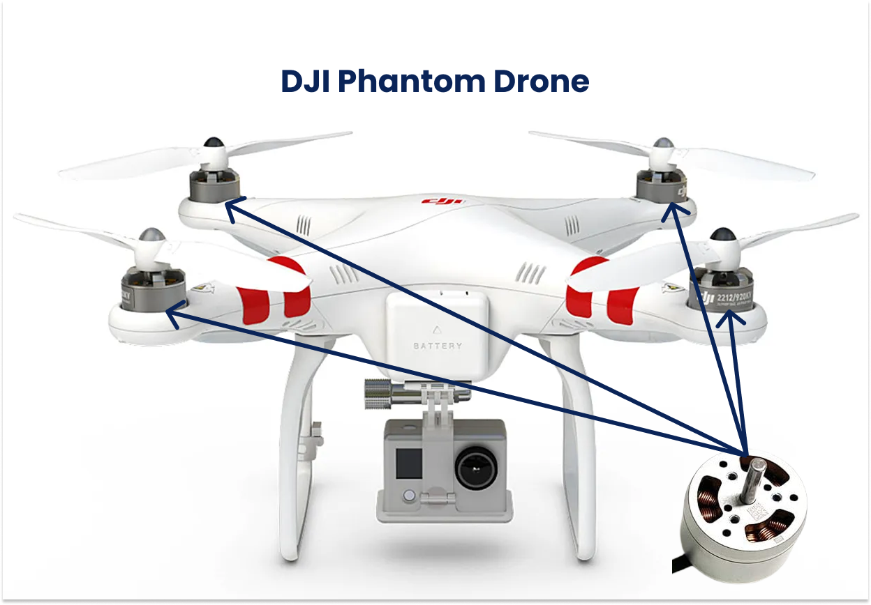 “Outrunner” refers to the fact that the neo magnet rotor is on the outside and spins around a fixed electromagnetic stator in the center. Because the spinning outer can has a larger radius, outrunners give you more torque for the same magnetic force (torque = force x radius). Because the outer can moves air over the stator, it keeps the motor cool under high load. And because of low rotational inertia and high torque from the NdFeB magnets, drones can accelerate and decelerate rapidly. No gearbox required.