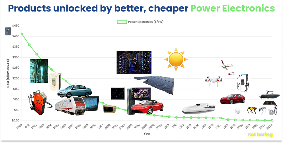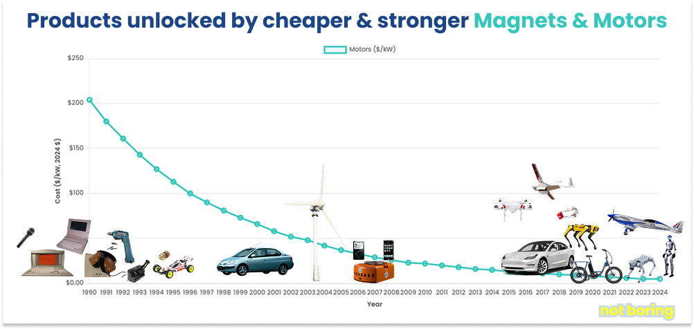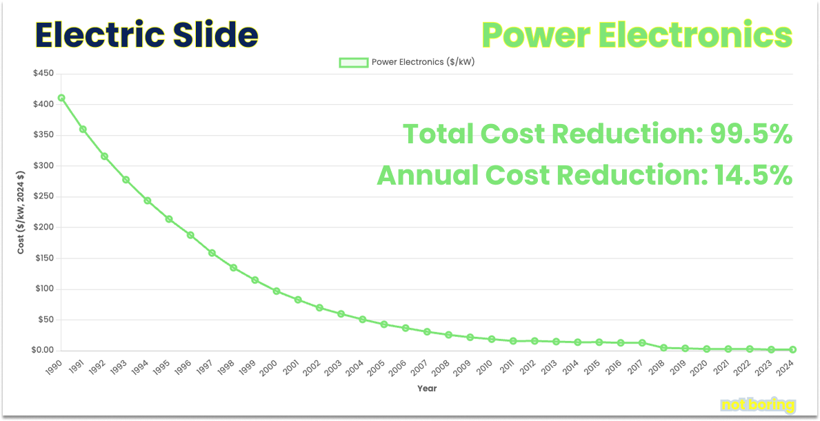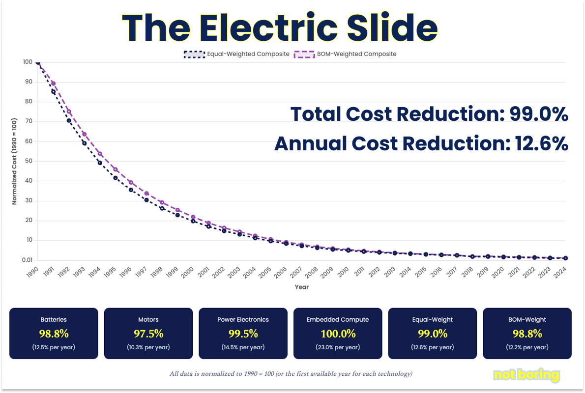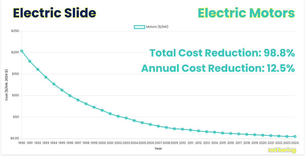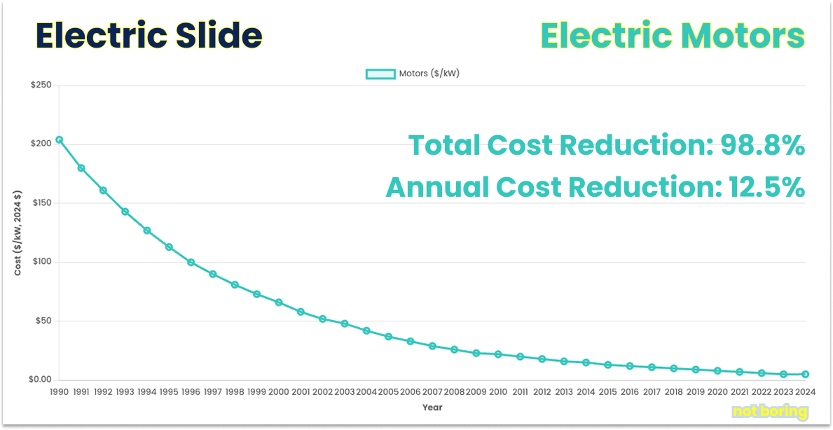 You have no idea how hard it was to find this data. It doesn’t exist in one place. It’s everywhere, in old catalogs, YouTube teardowns, government reports. The data isn’t clean: old hard-disk drives have higher $/kW in part because they needed so few kilowatts; the denominator was very high. Comparing that to a modern EV motor feels a little absurd, but it’s also how the progress actually happened, so we’re sticking with it. We used Claude and ChatGPT to help find all of the data, and you can find a list of sources here. This graph does its best to normalize across and account for a bunch of different industries that use electromagnetic motors, although in some cases, certain use cases achieved better $/kW performance. The Tesla Model 3, for example, got below $5/kW. It is directionally correct, and while specific years may be off the takeaway is the same: 98.8% reduction in the past 35 years.