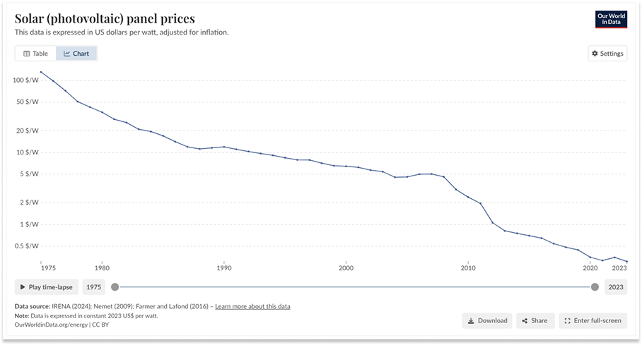 We are all familiar with the solar panel cost curves, which have seen solar power drop from $130.70 per watt in 1975 to $0.31 per watt today.