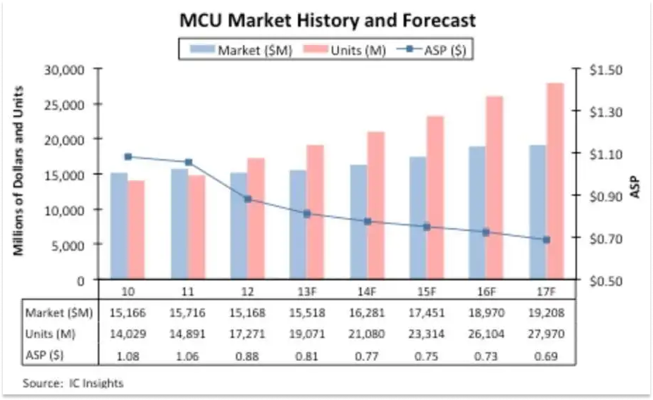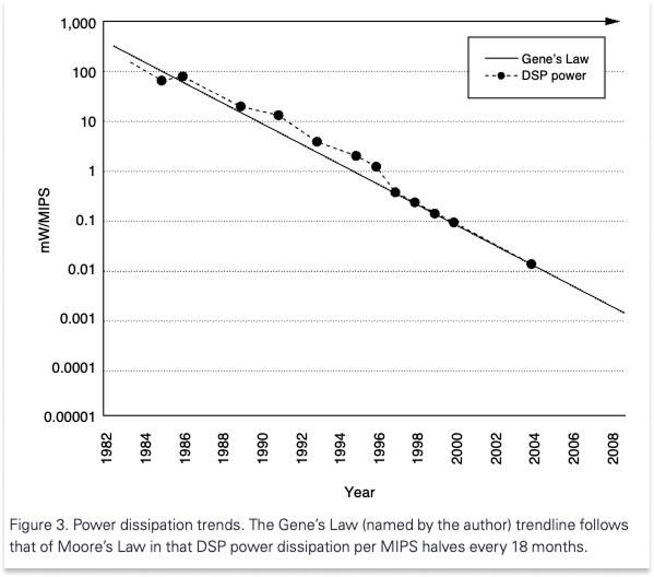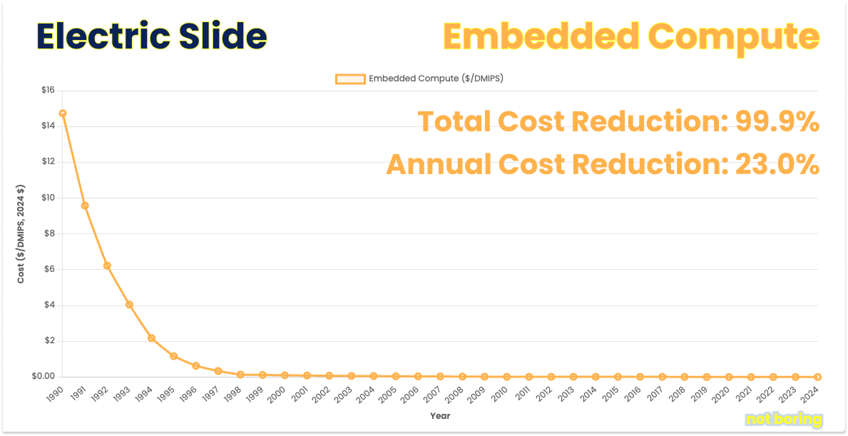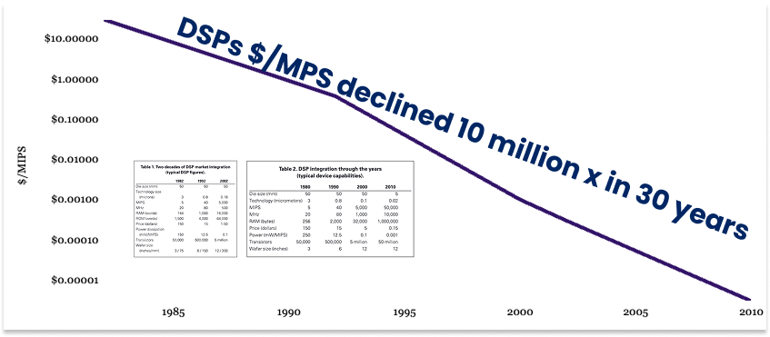 And since Texas Instruments commercialized microcontrollers (MCUs) and digital signal processors (DSPs) in calculators and kids toys in the late 1970s, the cost to run a million instructions per second (DMIPS) has fallen 99.9%, for an annual decline of 20% over the past 35 years: