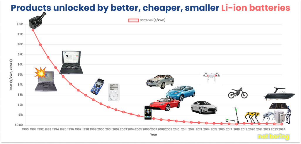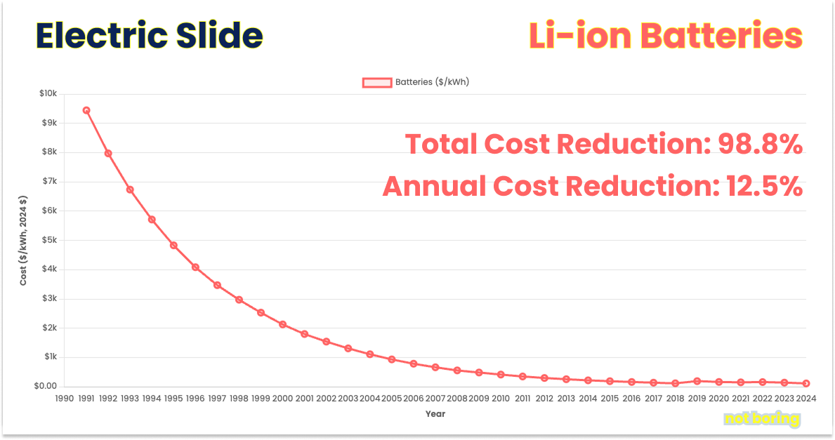 Since Sony started rolling out lithium-ion batteries in 1991, battery packs have gotten 98.7% cheaper, for an annual decline of 12.5%.