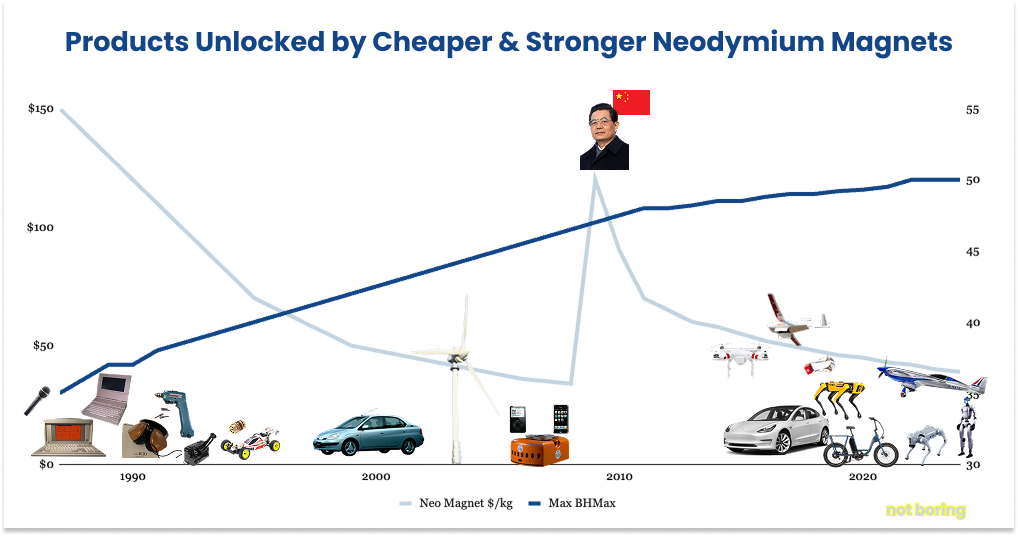 Most straightforwardly, it can be a buyer, as it always has been. The 2021 and 2023 National Defense Authorization Acts, as one example, bans the use of Chinese rare earth magnets in new military equipment beginning in 2027. They are willing to pay a premium in the short-term in exchange for security, resiliency, and new capabilities, and in so doing, can provide the initial demand that pushes American suppliers down the curve.
