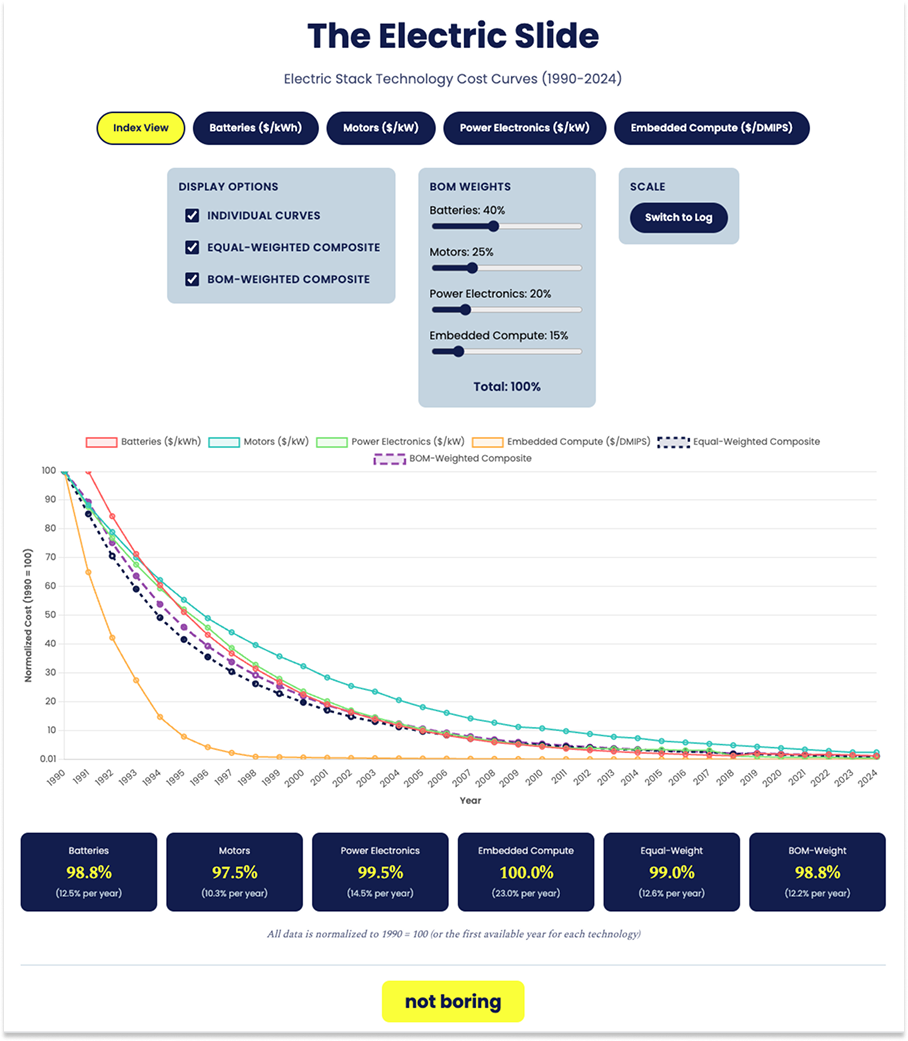 To the best of our knowledge, no one has ever built a composite of these curves: equally weight each component of the Electric Stack to understand how much less it costs to build an electric product today than it did in the past.