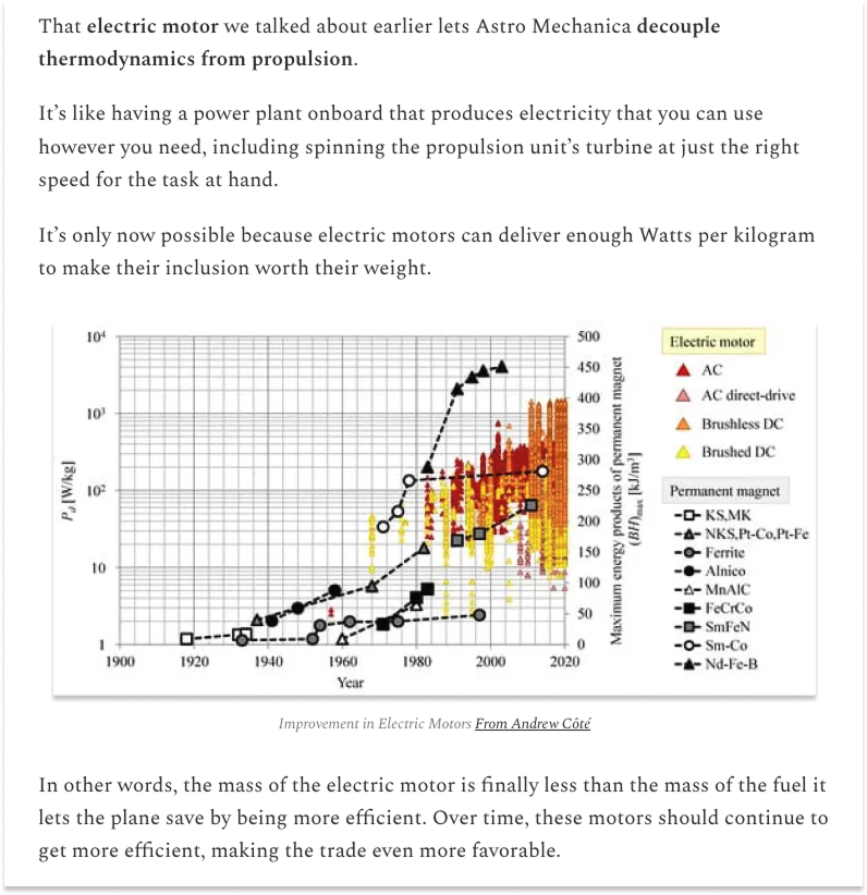 Astro Mechanica can build efficient supersonic planes, for example, because electric motors have gotten powerful enough for their weight. Electric planes will begin to make sense as batteries get more dense and motors more efficient. So too will flying cars. And if we want affordable humanoid robots, even more than smarter intelligence, we need better batteries, motors, inverters, and microcontrollers.
