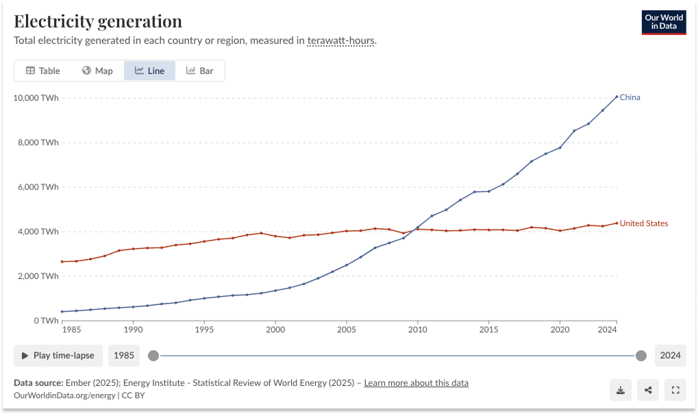 After catching up to America in electricity generation in just 2010, China now generates 2.5x as much electricity as we do.