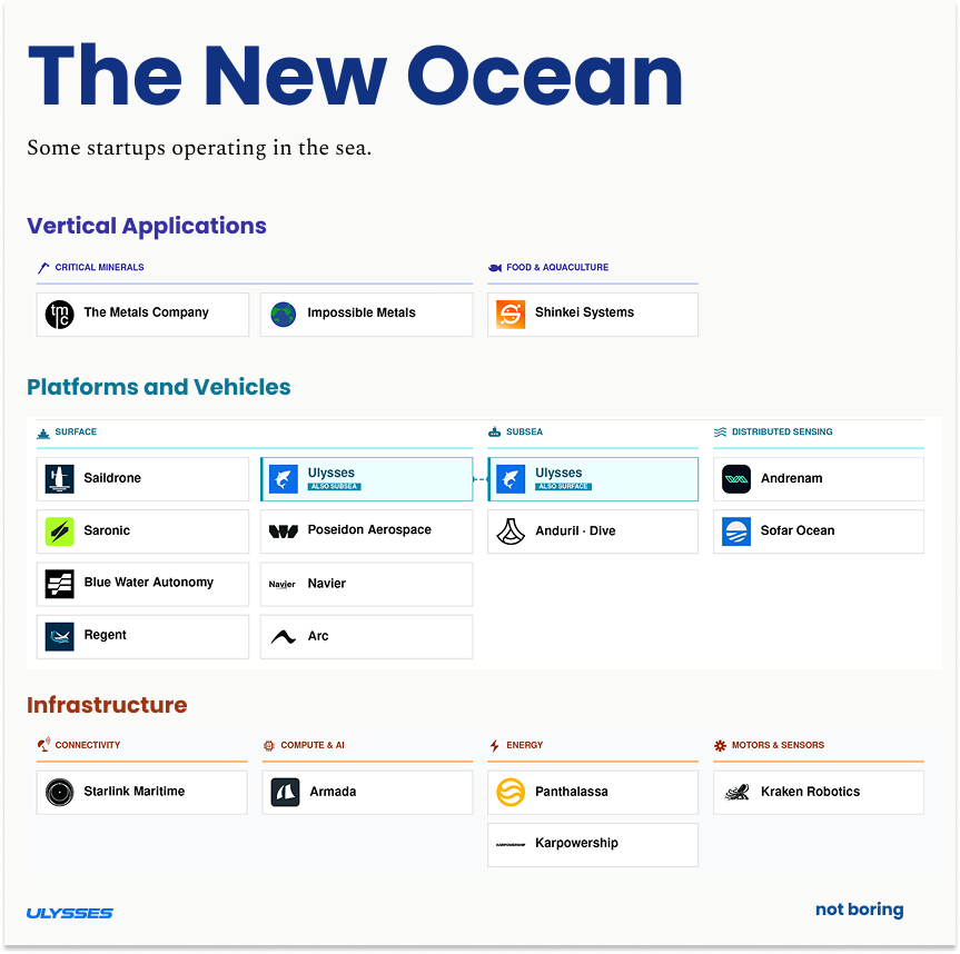 That said, we can imagine some specific opportunities, including but not limited to: managed fisheries at scale; critical mineral extraction with proper environmental monitoring; persistent maritime domain awareness sold as a subscription; autonomous shipping and smarter logistics; ocean energy at industrial scale; offshore compute powered by ocean energy and cooled by seawater; an undersea acoustic and optical communications network (the subsea equivalent of Starlink), connecting every vehicle and sensor in the water; a persistent ocean observation layer (the subsea equivalent of Planet Labs) continuously mapping the ocean in three dimensions; systematic scientific exploration of the 99.9% of the deep seafloor that nobody has ever studied.