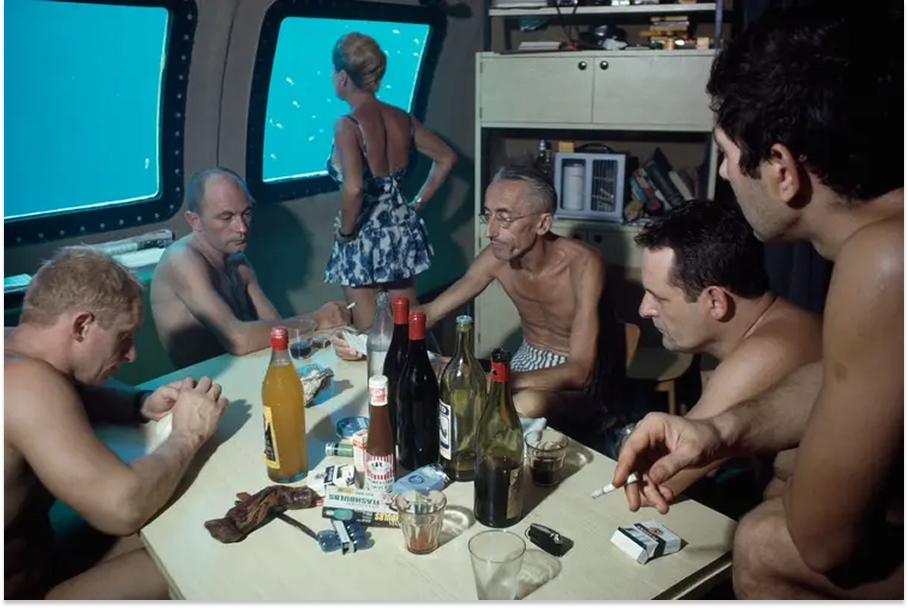 Cousteau had co-invented the modern scuba regulator and was one of the most famous people in the world. He built Conshelf, a series of underwater habitats where teams of divers lived for weeks at a time on the seabed. Conshelf II, built in the Red Sea in 1963, was essentially an underwater village: a starfish-shaped structure at a depth of 33 feet with bedrooms, a kitchen, hot showers, and a television.