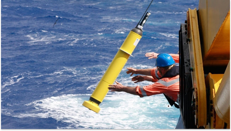 Today, our greatest effort at ocean observation is a network of 4,000 robotic floats called Argo, the 27-year-old “crown jewel of ocean observing systems.” Each of the 4,000 floats monitors an area larger than Portugal, surfacing once every ten days to transmit a single temperature reading. They are deployed like this…