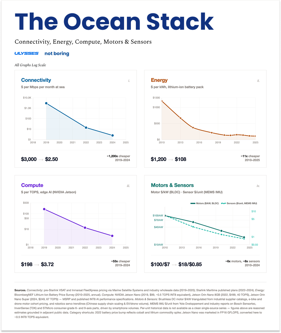 The scale of what opens up when you collapse the cost of persistent ocean presence is difficult to overstate. The ocean economy today is built on transit, extraction, and coastal adjacency, and it’s already worth trillions. Imagine what happens when you add persistent infrastructure, domain-wide monitoring, in-water energy, autonomous logistics, undersea communications, and a continuous observation layer covering 70% of the planet. The new economy will dwarf the old one. We just can’t see most of it yet, and that’s exactly what you’d expect at this stage.