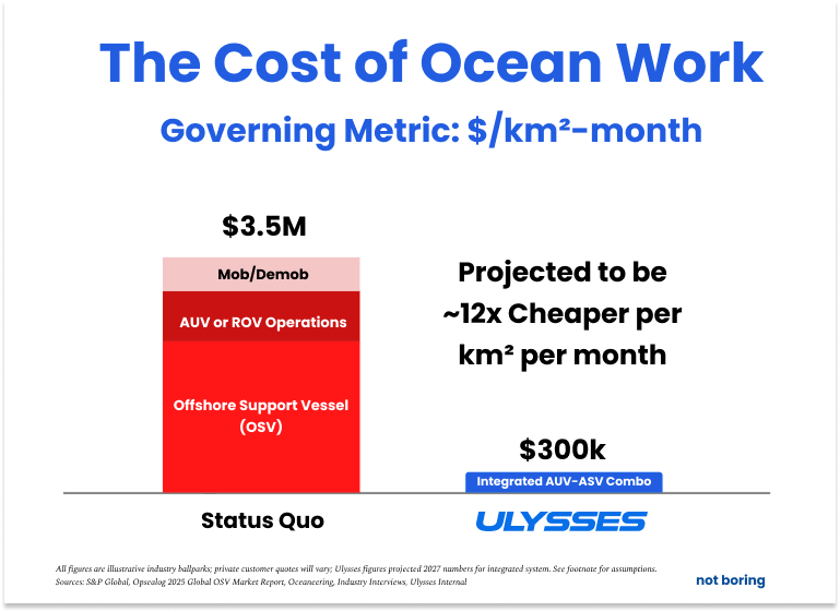 My co-founders and I think about the opportunity through a single governing metric: the cost of ocean work, which we define as the cost of active operation over one square kilometer of ocean for one month ($/km²-month).