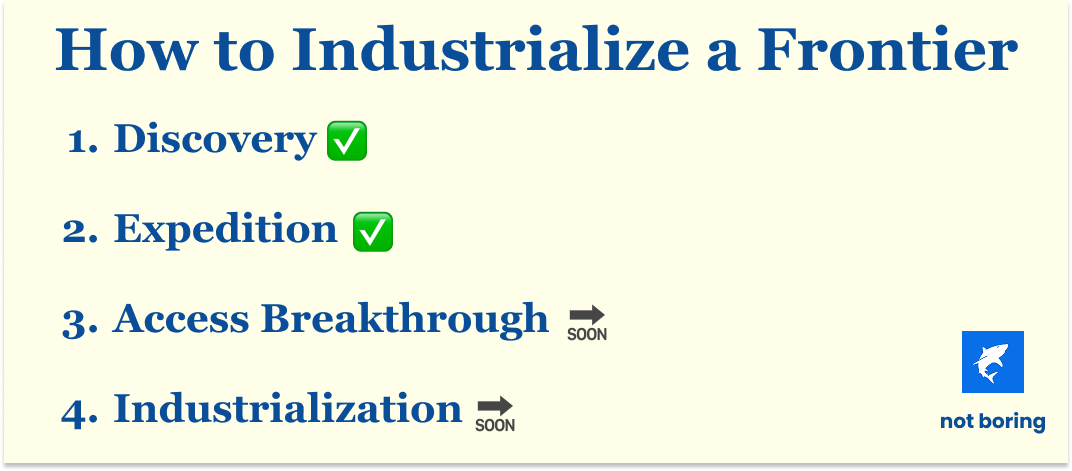 To industrialize a frontier means to transform it from a place with industries in it, exploring and opportunistically extracting, to a place built to support industries persistently and economically, at scale.