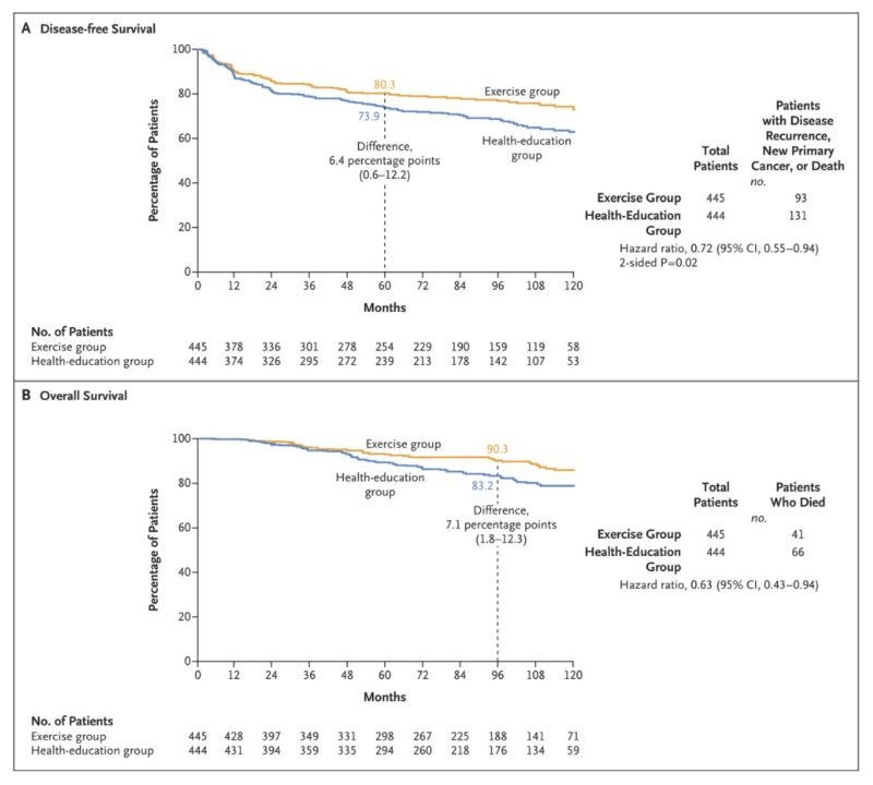 The new landmark phase 3 trial, called CHALLENGE, has shown that structured exercise significantly improves survival in colon cancer patients post-chemotherapy. The 900 patient study found that those in a three-year supervised exercise program had a 28% lower risk of cancer recurrence and a 37% lower risk of death over eight years compared to those receiving only health education materials. Basically, the risk of the cancer returning or causing death reduced by 1/3rd due to the exercise protocol.